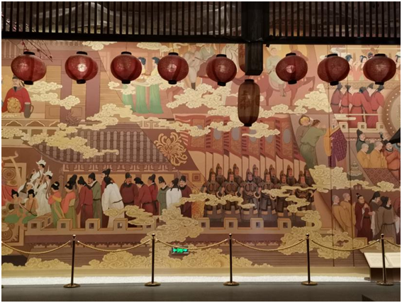 作为整个建筑的引领空间,序厅的装饰展示风格奠定了应天门遗址工程的旋律基调。位于中轴线上的迎宾屏风蚀刻出隋唐风格的几何装饰纹样,回应了了《礼记》中的“天子负扆南向而立”的记载。不同方位的壁画描绘了“天门肇建”、“武后登基”、“五凤翔翥”等洛阳定都时期的经典场景。