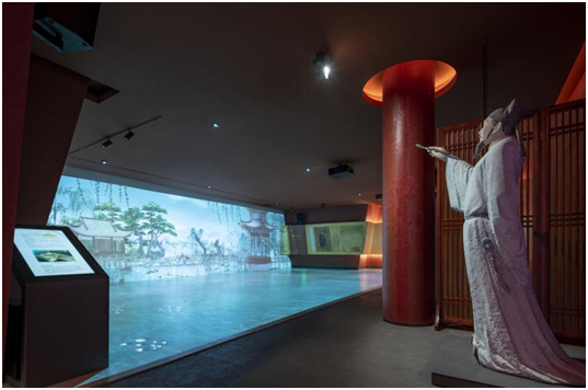 “乐天宅园四时之乐”沉浸式影视厅利用立体成像屏幕和互动投影技术,重现白居易设计的私家园林——履道坊的四时之景,令游客在领略白居易造景造诣的同时,深度体味其人生哲学与名篇佳作。