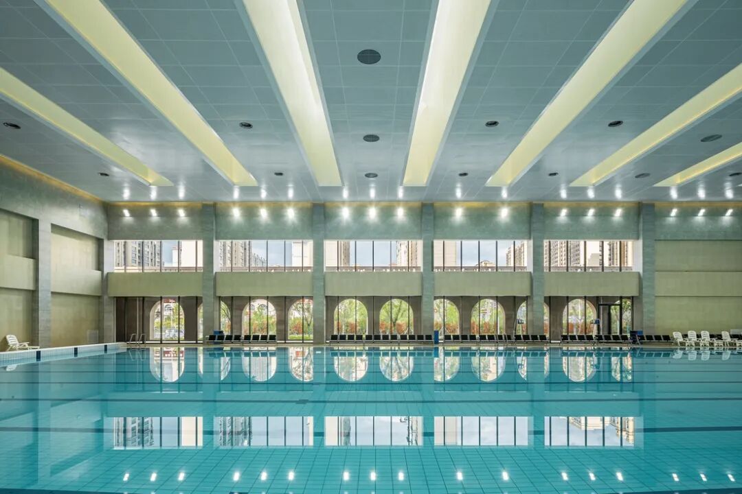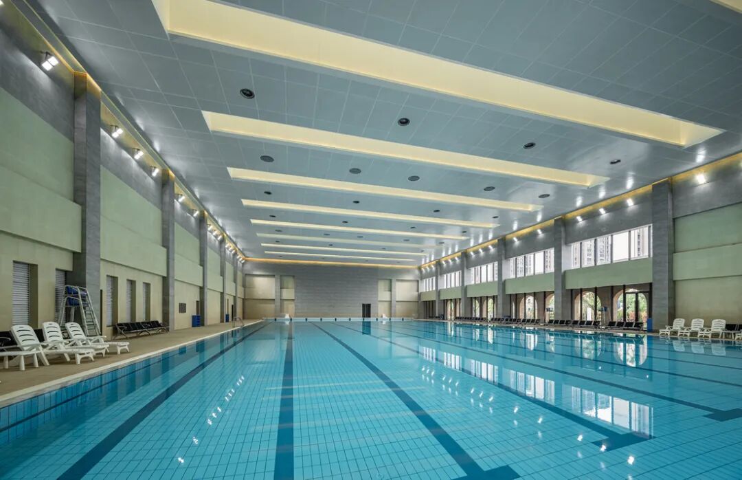 游泳馆延续了动感多彩的轻工业风,考虑到潮湿环境的影响,天花和墙面分别采用金属板和瓷砖饰面。此外,设计师还运用多种手段解决了强光和噪声反射问题,包括采用喷砂哑光表面的饰面材料、经过穿孔吸声处理的吊顶金属板、强化柱梁结构的造型墙面。