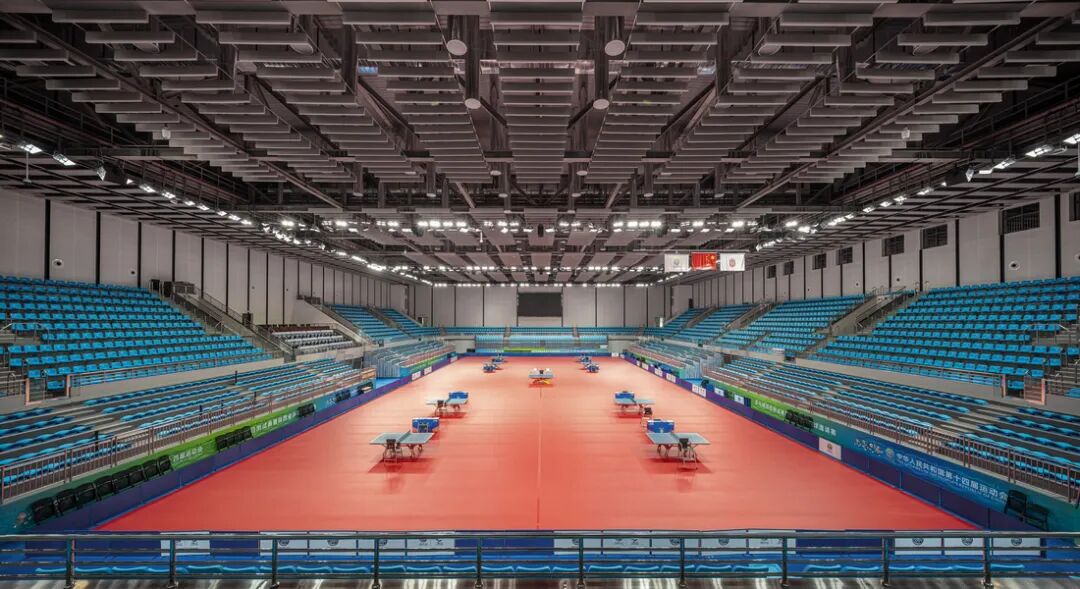 场所从本质上来说,是记忆和行为的物化和空间化。而最早的“场所”,就是古代人“聚会”的所在地——“Arena”这个词既有角斗场的意思,又指圆形体育场和竞技舞台。因此,为体育建筑注入“场所精神”和“空间仪式感”,就是溯本正源。正是沿着这个思路,我们工作室在对综合馆、训练馆和游泳馆的室内设计过程中,力求在满足场所功能的基础上,最大限度地发挥出场所的“精神”内涵。所以我们在体育中心场馆的整体风格把握中,增加了清水混凝土、金属网板、LED透光膜等装饰材料比重,并叠加了色彩明艳的地材、座椅和温暖柔和的木饰面,使建筑的内外呈现出现代细腻与传统粗粝、时尚轻盈与质朴厚重、冷峻理性与活力感性的审美张力,形成对立统一和谐整体。与此同时,我们还充分考虑到注重赛时与赛后利用相结合,在满足全运会比赛场馆要求的前提下,考虑将来教学活动要求和对社会开放的可能性,加强了功能空间兼容性、人性化设施和机电条件预留等深化设计。