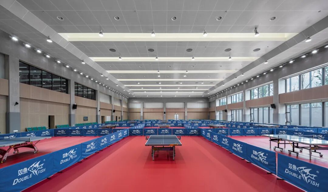 综合馆是兼顾比赛和教学的综合性运动场馆,天花采用开放式吊顶,悬挂有降噪功能的灰白色吸音垂片,在装饰效果、照明设备和造价之间取得了很好均衡。中央比赛区上方的垂片,结合自然光照明导管和人工照明设备布局,呈矩阵式排列,四周观众席上方则呈线性排列与矩形场馆四边相垂直,将比赛场地中央的运动活力向四周发散。这一手法延伸到比赛场地外围的环廊吊顶和装饰中,形成贯穿整体的流动气息。