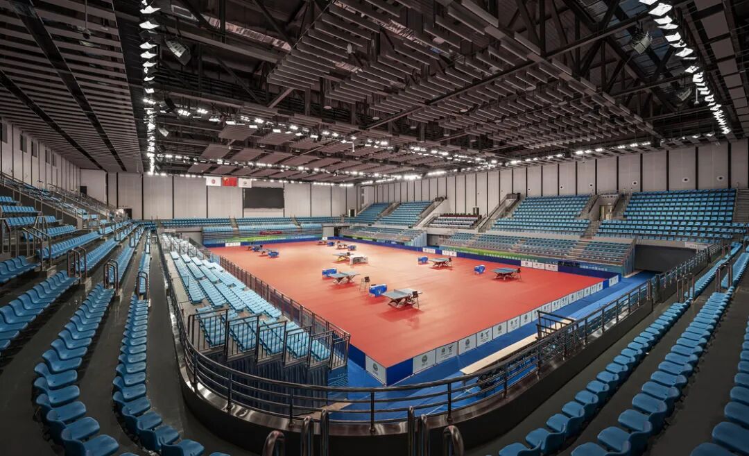 比赛场内墙面采用银灰色金属穿孔板内置吸声构造,并用深灰色金属板凹槽形成竖向的线性装饰,将天花的线条感自然地延伸至地面。墙面线性装饰的间距,自LED信息大屏幕向两侧墙面递减渐变,形成有韵律的视觉引导效果,并与灵动的天花造型、彩色的观众坐席一同营造出动感氛围。