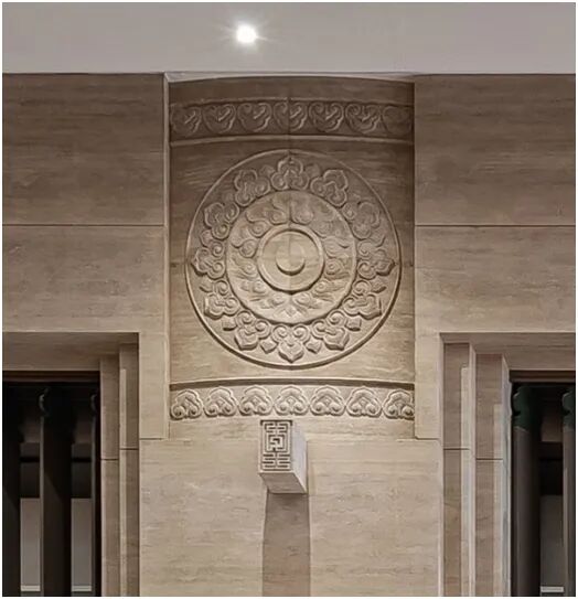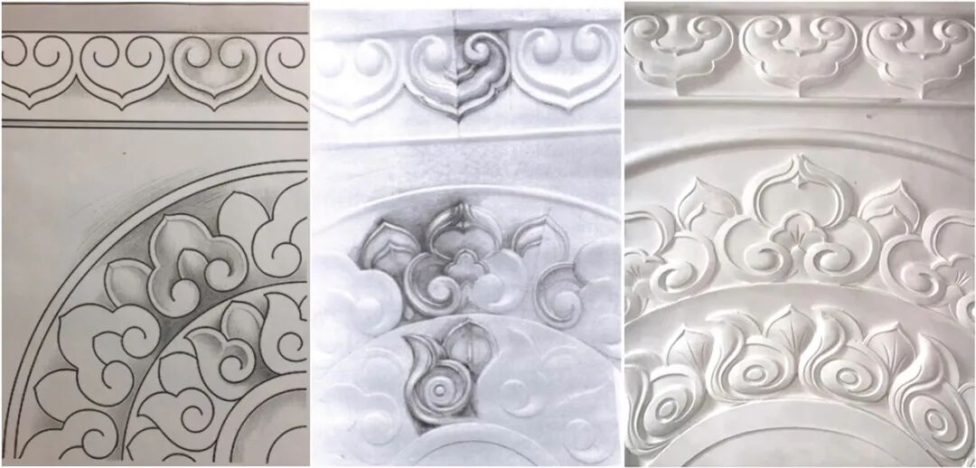 大厅柱头石雕纹样源自传统旋子彩画,将祥云与宝相花元素融入其中进行重组排列转变为石雕语汇,使纹样更为饱满、对称。以素描手法表现纹饰起伏及层次关系,制作雕刻小样,针对纹样厚度、转折、穿插等关系进行反复研究打磨。