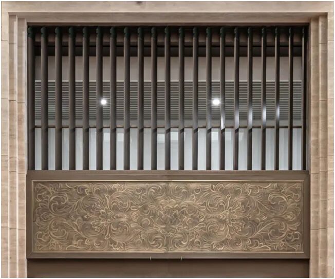 大厅柱廊铜腐蚀纹样以宝相花为主题,借鉴明清木雕以及瓷器、珐琅器纹样进行深化整理,将卷草纹与宝相花纹样相融合,于变化中求秩序,单色中求层次,素雅而内敛。