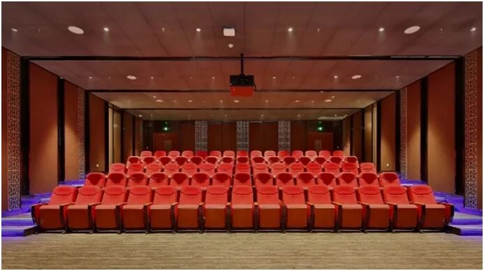 放映厅左右空间墙面设计延续了建筑外立面的竖向线条,造型延伸至天花,木饰面与镂空传统纹样构成虚与实的对比关系,形成围合式的对称构图。