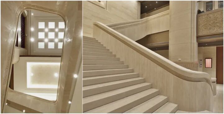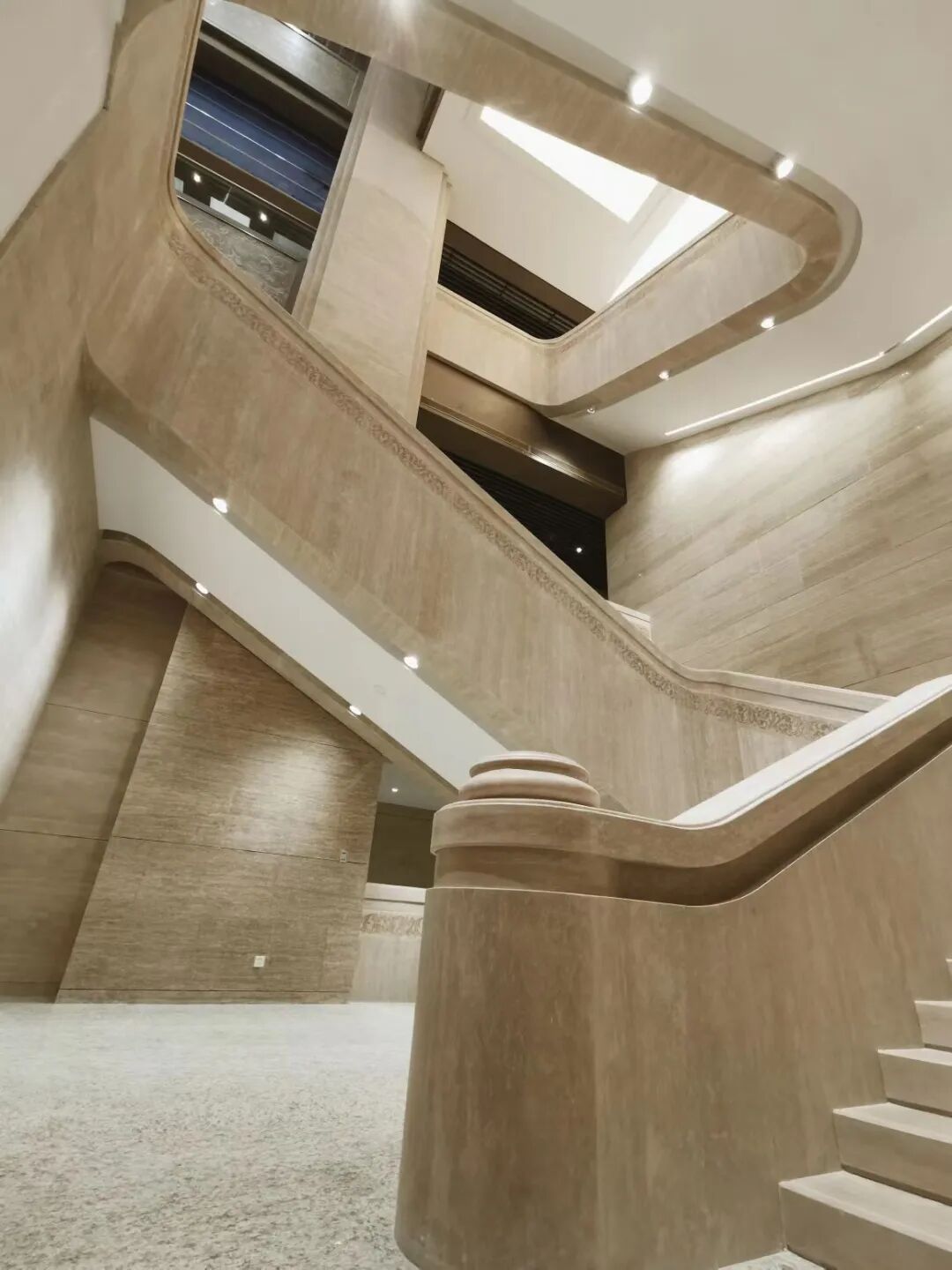 大厅中央楼梯如两条蟠龙双向蜿蜒盘旋,连接上下楼层。扶手转角曲面结构与步梯台阶圆角设计处理相呼应,线条圆润流畅。