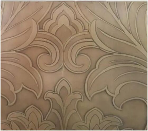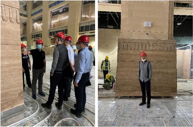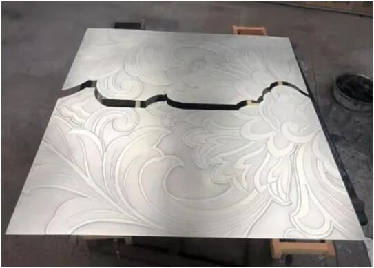 柱廊装饰板尺寸较大,标准幅宽铜板不能满足整幅制作,必须采取拼装方式。经多次打样试验,将工艺简单、造价较低的横纵四拼方式更改为沿花型边缘线以水刀切割再拼装的方式,使铜板拼缝可视最小,连接最自然,保证了纹样的自然感与完整性。
