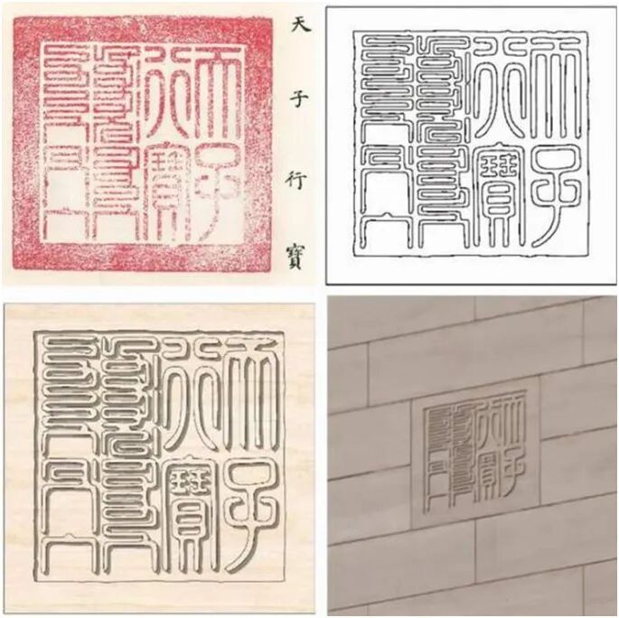 ▲玉玺的印迹通过石材浮雕呈现(从左至右为玉玺印章、CAD图、模型、上墙最终效果)