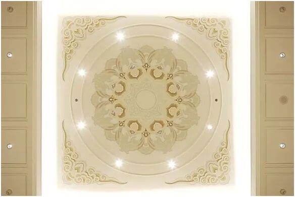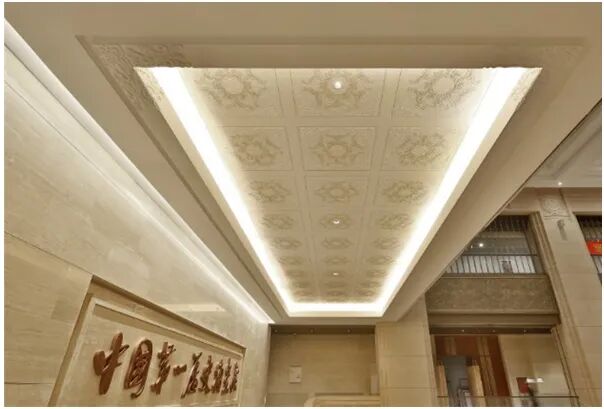 中央楼梯顶部装饰由30组宝相花沥粉纹样组成,边角装饰祥云浮雕纹样,增添文化性及尊贵感。