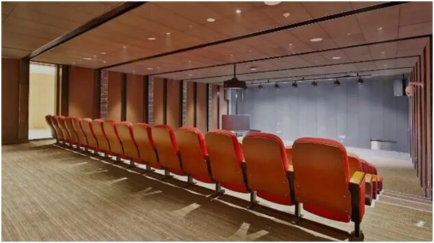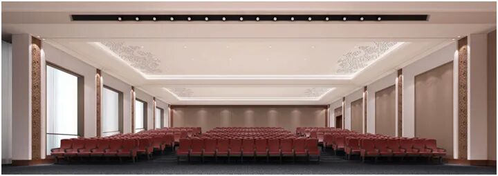 学术报告厅与多媒体放映厅整体设计追求简洁明快的空间趣味,以浅木色为主。报告厅舞台台口与墙面造型与建筑主入口一脉相承,墙面上的云水纹饰内涵丰富、细节考究,与空间节奏形成极好的视觉呼应。