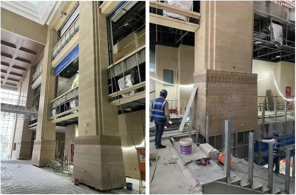 ▲柱头造型与纹样来自故宫“旋子彩画”通过石材浮雕形式呈现.