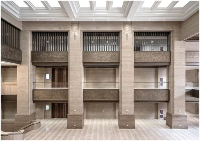 一史馆新馆大厅采取中轴对称的空间布局方式。大厅双向中央楼梯、两侧柱廊与主入口斗拱大门形成轴线对称关系,与顶棚藻井造型共同渲染出中正端庄的空间氛围。大厅主石材有意沿用了建筑外墙的米黄色洞石,纹理细腻柔和。古铜色金属材质能有效地调和空间色彩,并增添层次感与厚重感。两侧柱廊依次阵列式排开,简化的“须弥座[1]”柱础与“旋子彩画[2]”浮雕柱头彰显明清皇家建筑的审美规制。柱廊上部采用“红绿头牌[3]”造型形成半封闭环廊,与建筑外墙的“奏折”元素相呼应。