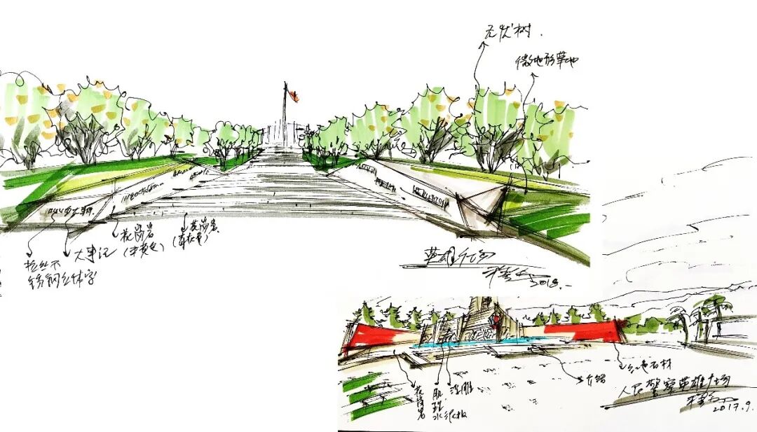 秉持“以人为本”的核心创作理念,穆老师运用中轴线和分级台阶等多种设计手法,丰富立体的空间层次;采用非对称的空间布局,增加视觉感官体验;通过流线穿插的设计方式,营造休闲放松区文娱氛围。最终广场既体现了纪念仪式所需的庄重与威严,又满足了观访者平时休憩放松心情的需要,塑造了和谐统一的环境氛围,同时增加人们情感与公共空间的紧密联系,解决了仪式祭奠与休闲放松的和谐统一问题。