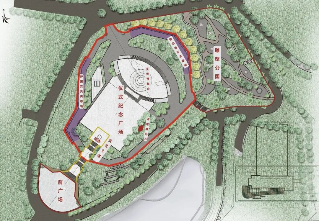 该项目总占地面积3.5万平方米,可同时容纳4000人参加纪念活动,是目前广东省最大的红色文化教育传承基地。广场分为两大功能区域:仪式纪念区和休闲放松区。在仪式祭奠区又分出两大空间,即仪式广场空间和静思缅怀空间。两大区域如何在区分不同功能的同时又保持空间上的统一、庄严肃穆与轻松恬静的氛围如何转换承接,是本项目设计中的一项难题。