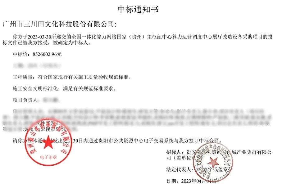 本次项目中标是三川田产品品质、技术实力、服务质量等综合实力的体现,是公司抢占产业数字化场景制高点、助力建设全国“算力”高质量发展展示高地的重要一步。