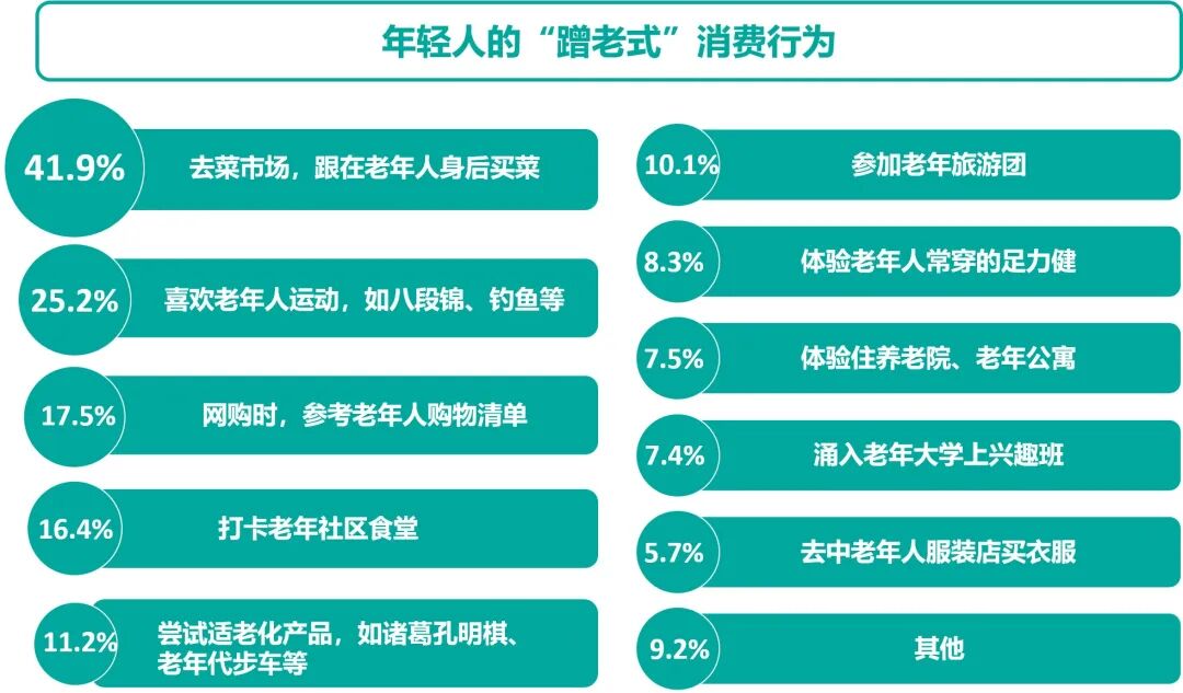越来越多的年轻消费者频频“闯”入老年生活场景,如跟随老年人买菜、练习八段锦、打卡老年食堂、参加“夕阳红”旅行团,这种“蹭老式”行为蔚然成风,成为新时尚。