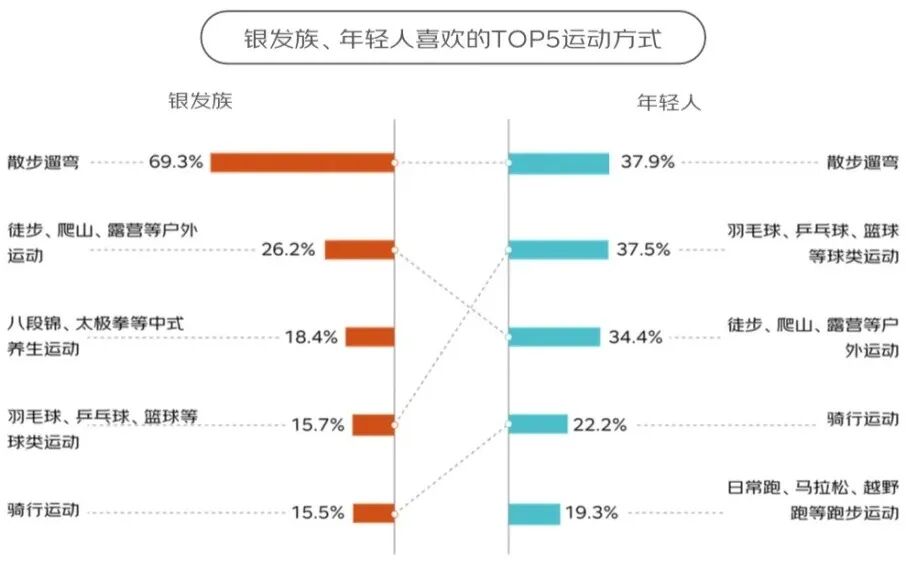 运动偏好——散步遛弯、户外、球类、骑行成银发族、年轻人运动“顶流”