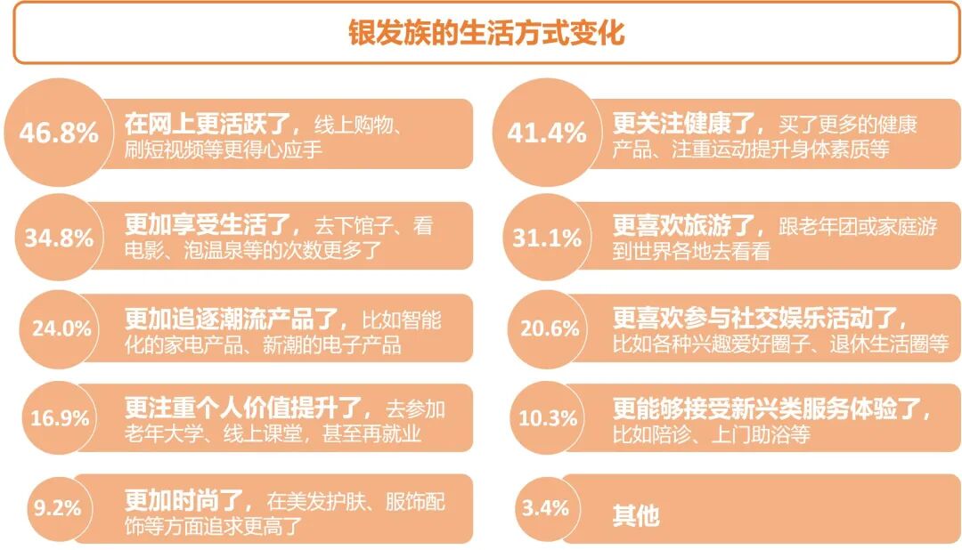 新一代银发族,特别是60后群体,受教育程度高、消费能力强、易于接受新事物,正逐步打破“勤俭节约、不爱消费”的旧标签。他们以全新的生活态度和高消费能力,跨越数字鸿沟,注重自我投资与社交健康,追求个人价值提升,积极享受生活。银发族正以崭新的面貌,展现出活力四溢、追求品质生活的积极形象。
