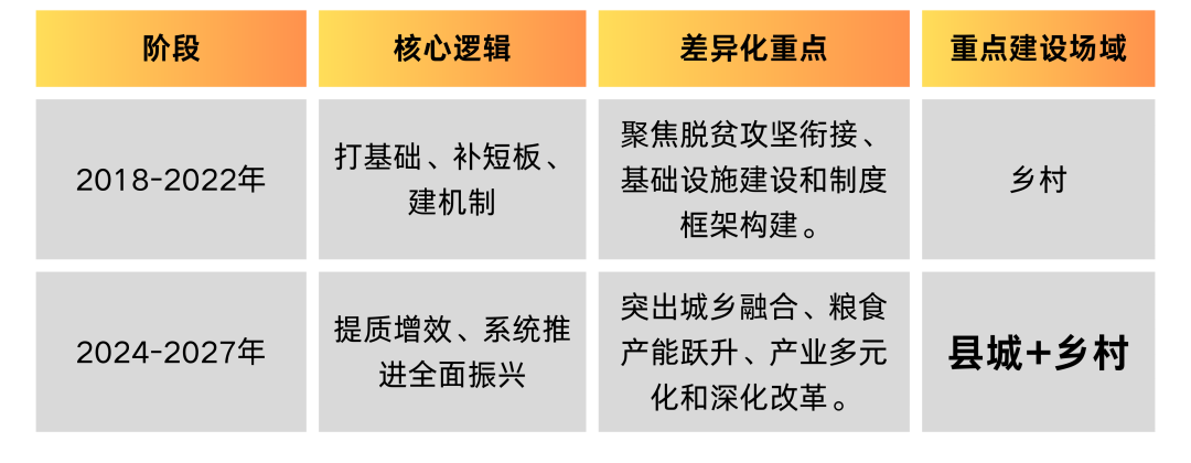 每个阶段均围绕国家粮食安全、农民增收、城乡融合和生态宜居等核心议题,但政策工具和实施重点随发展阶段动态调整,而调整中不难发现的一大策略转变就是政策实施场域的变化,从农村的单点建设转变成了县域统筹的城乡一体化,意味着在接下来的5年里,县城将成为推进下阶段全面乡村振兴的关键之所在。