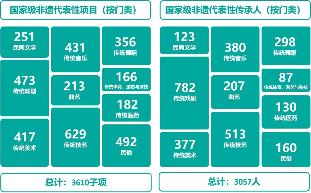 目前,我国有43个项目列入联合国教科文组织非物质文化遗产名录、名册,居世界第一;已建立国家、省、市、县四级非遗名录体系,认定非遗代表性项目10万余项。国务院先后公布了五批国家级项目名录,共计1557个国家级非物质文化遗产代表性项目,按照申报地区或单位进行逐一统计,共计3610个子项。国家级名录将非物质文化遗产分为十大门类,分别是民间文学,传统音乐,传统舞蹈,传统戏剧,曲艺,传统体育、游艺与杂技,传统美术,传统技艺,传统医药和民俗。截至2022年11月,国家级非物质文化遗产代表性传承人共3057人。