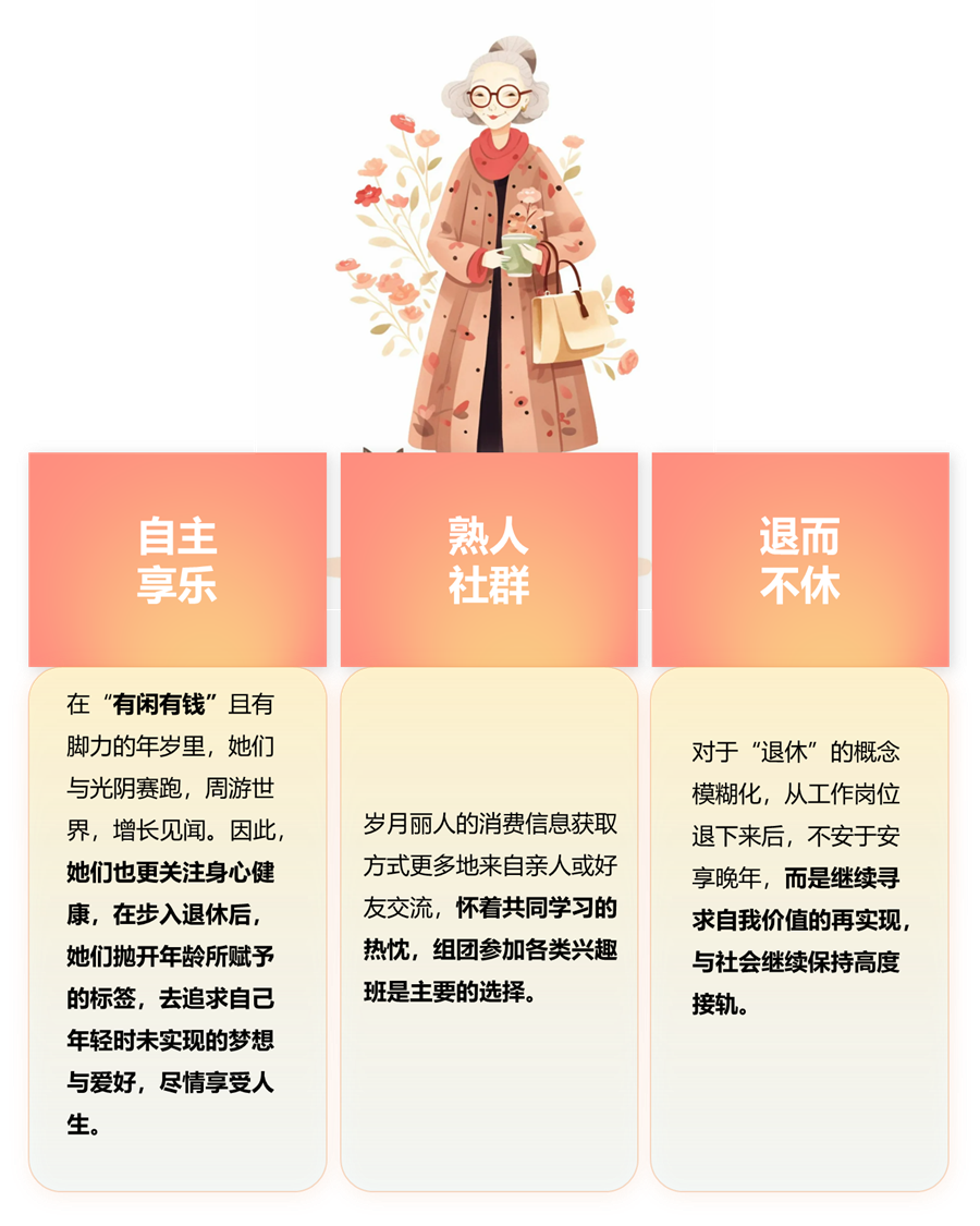 “岁月丽人”指具备一定消费能力,而又逐渐步入退休年纪的60后 “新银发族”。经历过物质匮乏的年代,她们的消费体现出时间维度的补偿性,这一代女性产生了“享老”的新观念,因此也被称为“岁月丽人”,她们也是未来消费客群边界拓展的重点对象,是拉动 “新银发经济”的消费新触点。