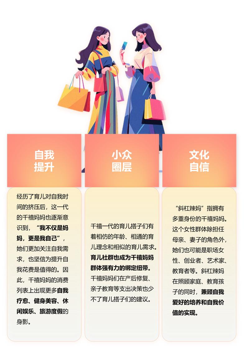 千禧妈妈是指80后千禧一代成家立业、结婚生子后,成为千禧妈妈女性消费新群体。她们敢于挑战传统的观念,表达自己的观点和想法,勇于遵从自己内心的声音,自我感受放在一个重要的位置。