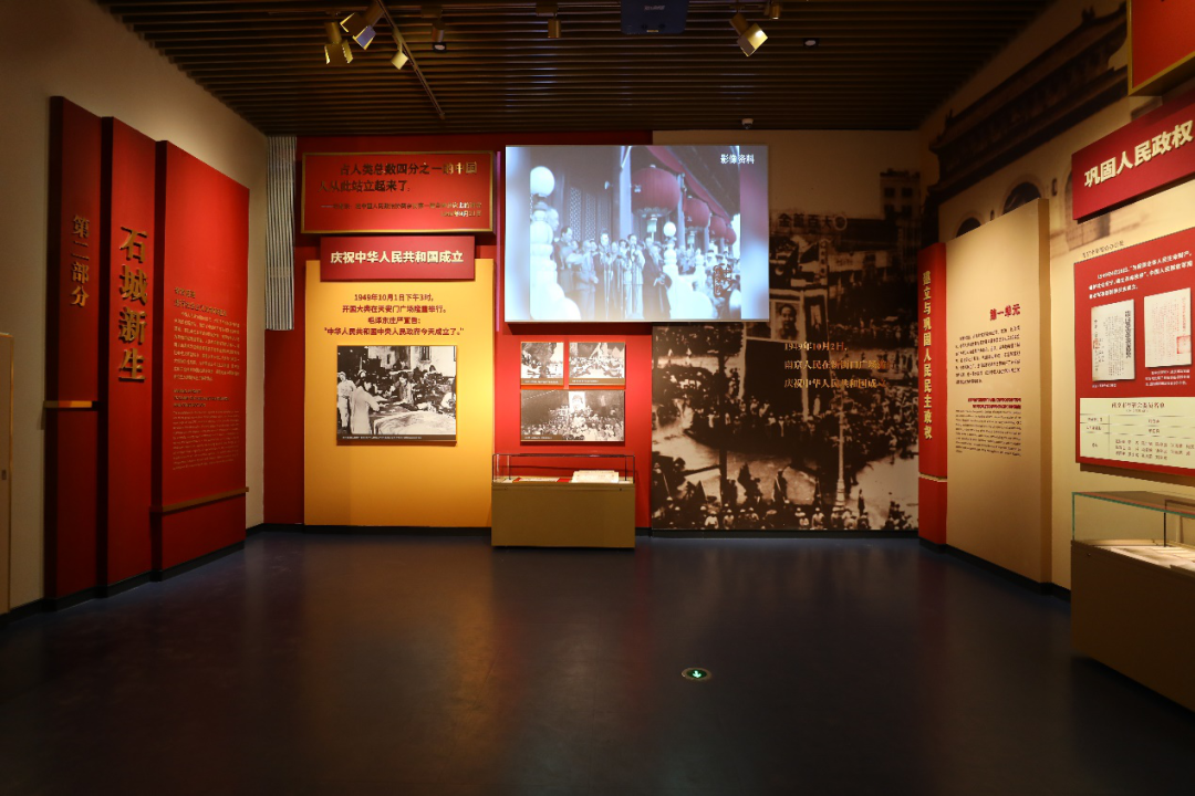 中华人民共和国的成立,开启了中华民族伟大复兴的历史新纪元,揭开了中国共产党在南京历史的新篇章。小序篇空间,通过投影、展板、展柜等手段,以影像资料《开国大典》统领,辅助赶制五星红旗、新街口大游行照片等内容,全景式展现了南京人民欢庆中华人民共和国成立时的盛大场面。