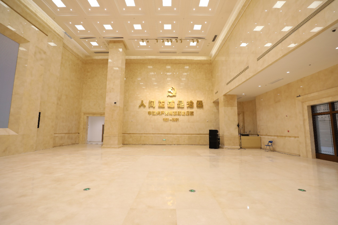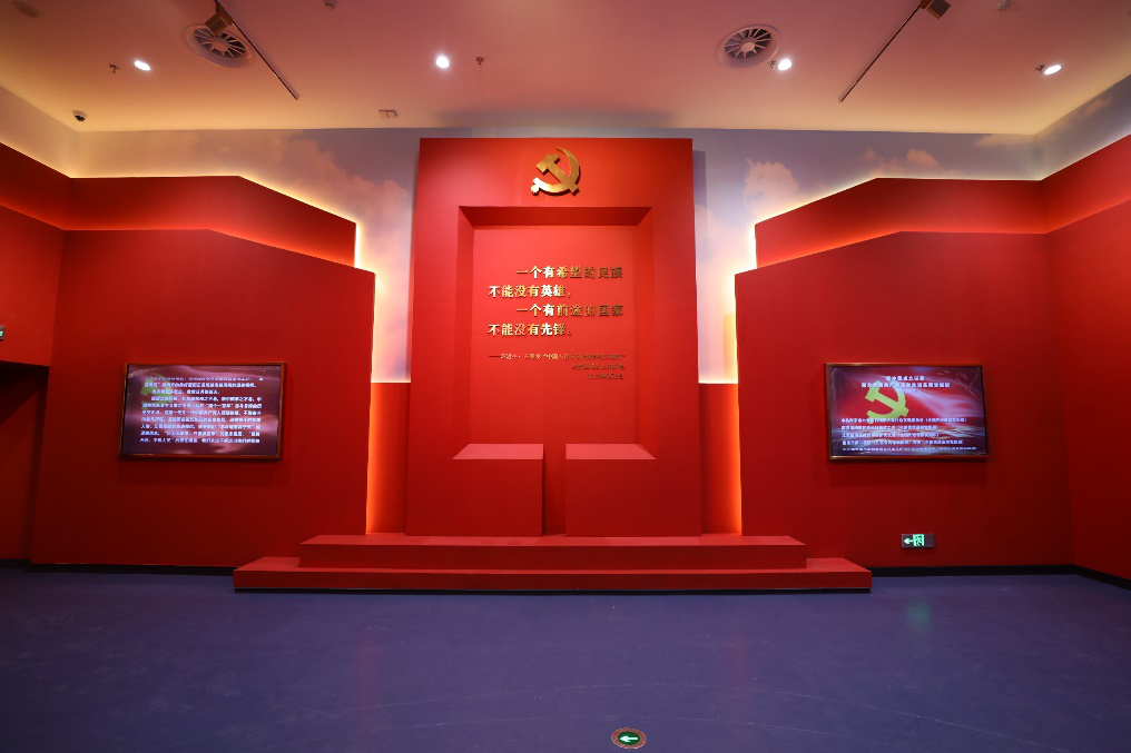 序厅:以简洁手法营造庄严肃穆、沉稳大气的殿堂仪式感,同时作为功能空间承载宣誓教育等活动。右侧镌刻:展览名称“人间正道是沧桑——中国共产党南京历史展览”;正前方LED大屏播放《人间正道是沧桑》专题影片;左侧镌刻:中国共产党人的初心和使命,就是为中国人民谋幸福,为中华民族谋复兴。