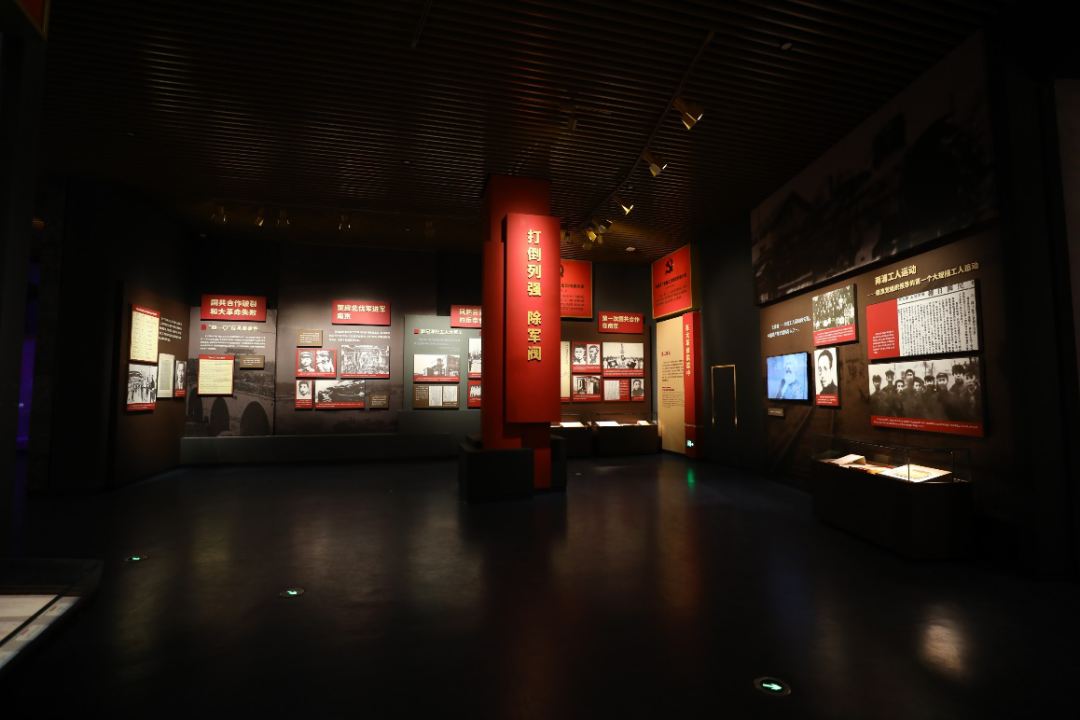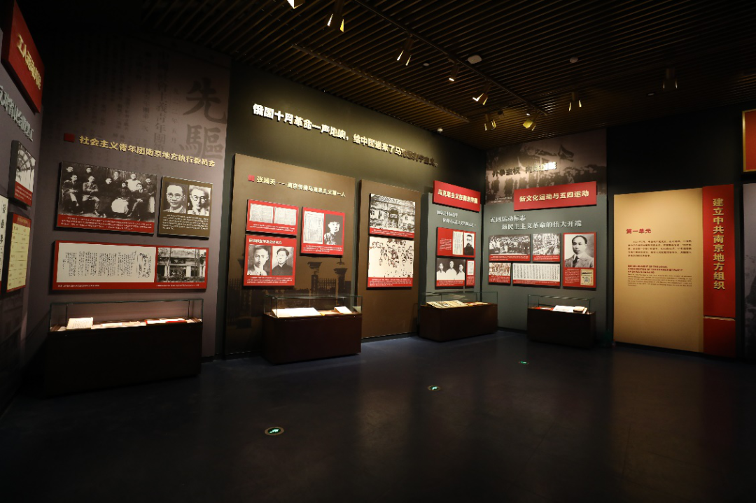 各种力量的艰难探索都失败了,俄国十月革命一声炮响,给中国送来了马克思列宁主义。1919年,马克思主义之光已在南京闪耀,张闻天成为南京传播马克思主义第一人。大体块展面、金属立体字、文物展柜有序组合,呈现了中共南京地方组织的建立。