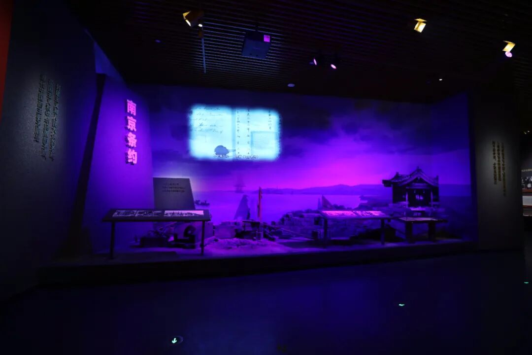 《南京条约》场景设计由投影、半景画、艺术装置与清代铁炮、内容信息带、中英文《南京条约》复制件组成,再现了西方列强用坚船利炮打开了中国大门,中国开始沦为半殖民地半封建社会,实现中华民族伟大复兴成为全民族最伟大的梦想。