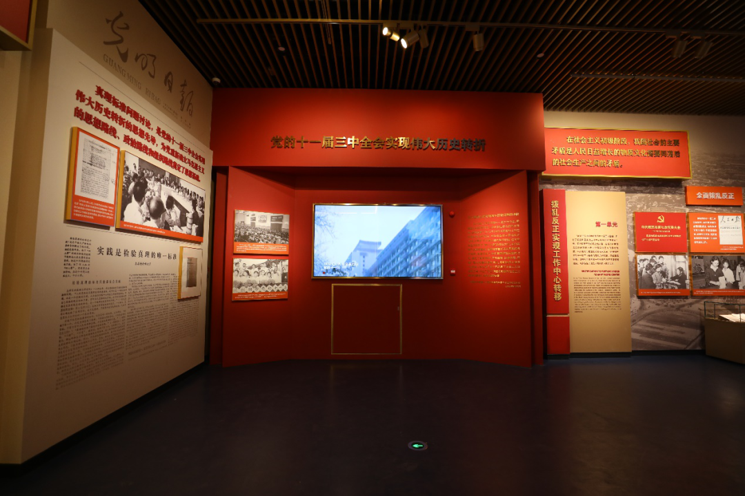 党的十一届三中全会艺术造型装置:通过金属字、多媒体专题短片、图文展板、《关于建国以来党的若干历史问题的决议》立体字组合,振翅展开,展现实施改革开放这一伟大战略决策。