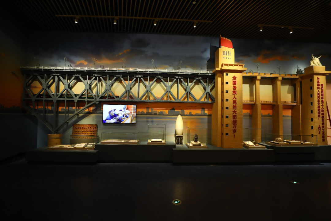 南京长江大桥场景,以南京人的视觉,通过长江掠影全景画、大桥模型等比例缩比复原、南京长江大桥专题影片、阵列排放的大桥建桥时的文物实物,立体化展现了社会主义建设时期的伟大成就——南京长江大桥。