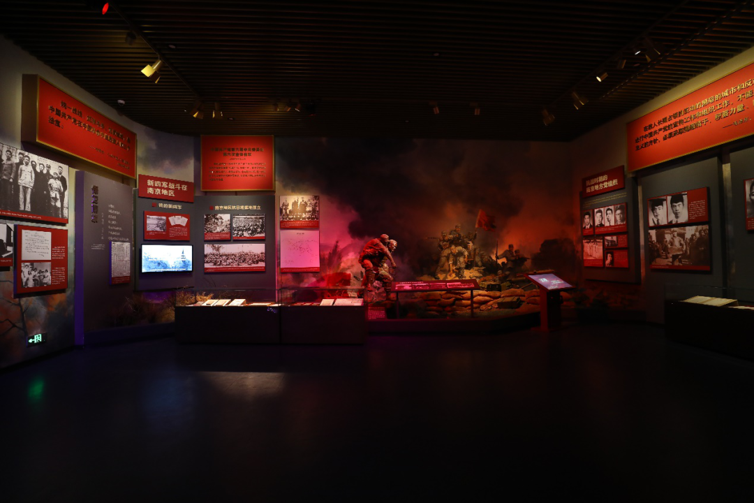 新四军战斗在南京地区场景设计,以金牛山战斗半景画为背景,以“铁的新四军”专题影片统筹展开,以朱二先生抢救新四军伤员雕塑为叙事载体,以南京地区抗日民主政权建设短片、抗战歌曲点播台互动体验,全方位展现了抗日战争期间中国共产党中流砥柱作用。