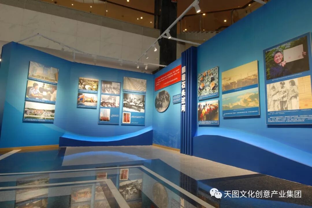 “改革开放富起来”部分采用蓝和绿为主色调,通过色彩,利用场馆公共空间的高度优势调整观众的情绪,缓解之前沉重的空间感受。