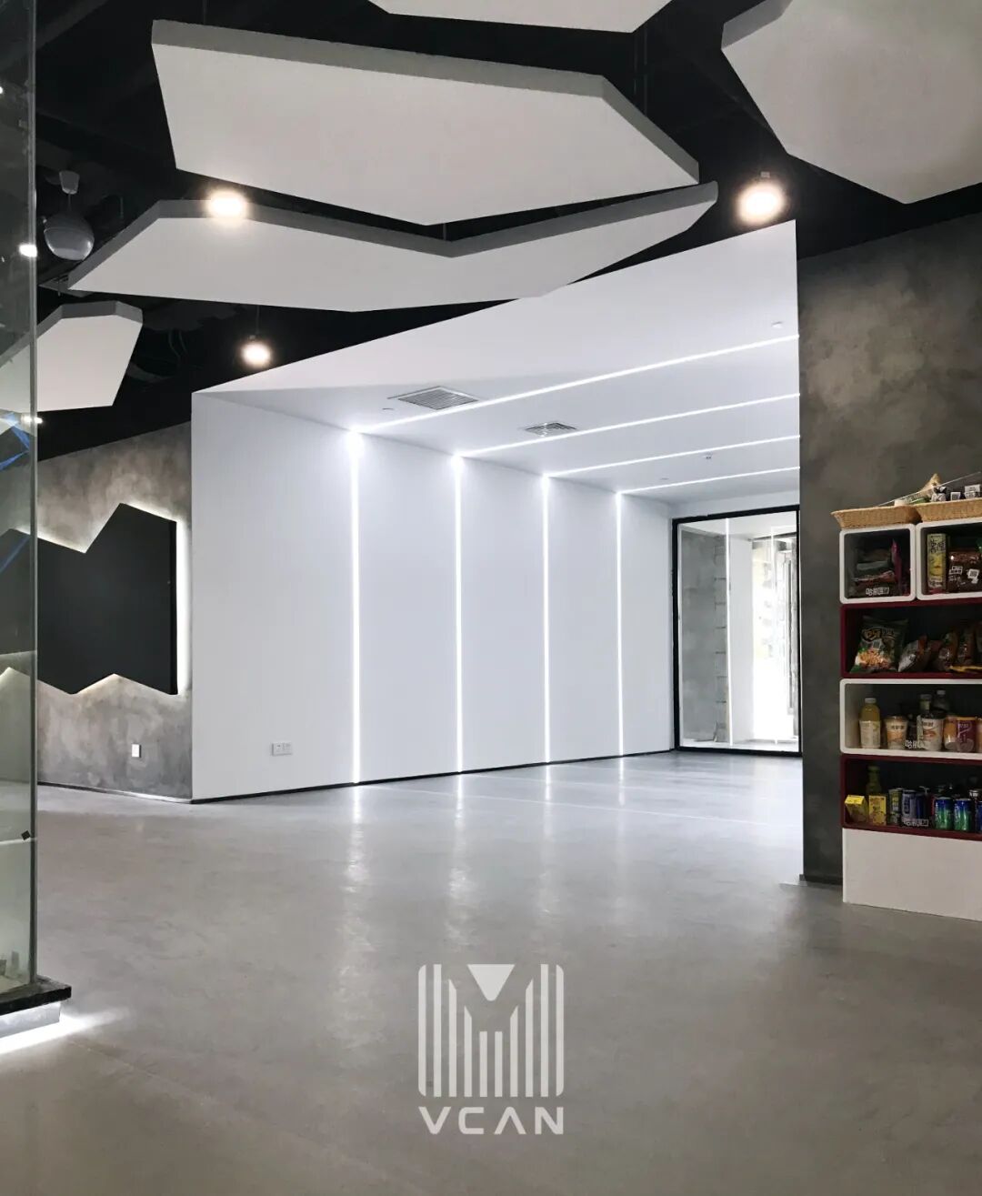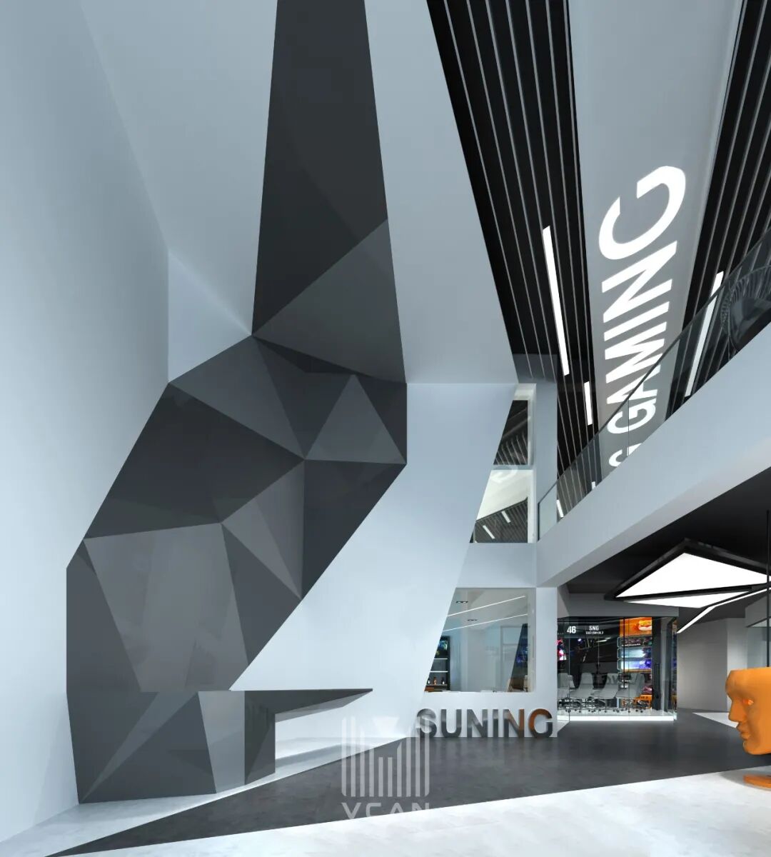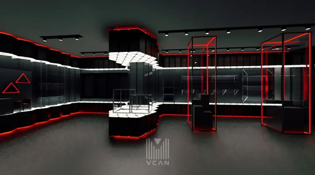通过设计上人性化的细节处理,合理穿插抽象色彩元素,以及对光影的提炼与几何三角形元素的灵动多变,再融入苏宁SNG电竞战队富有朝气又团结稳健的气质,让整个空间营造出科技感与工业感结合的感觉,让人仿佛来到了一个光陆流离的电竞世界。