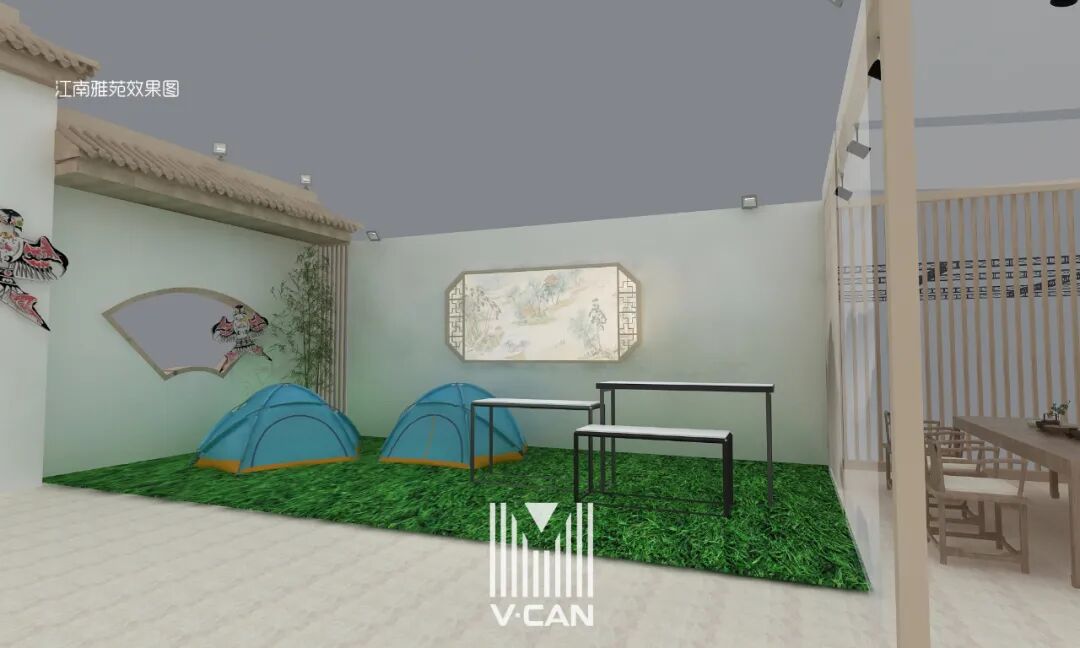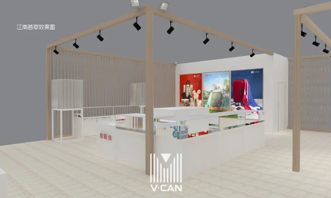 展厅以“文荟江南,礼遇东西”为主题,整体布置以中式搭建为主,选取粉墙黛瓦、各式飞檐与木质窗棂等典型的江南建筑元素,通过现代时尚的设计,呈现出兼具江南文化气韵和海派风格的清新、雅淡、大气、简洁的氛围。