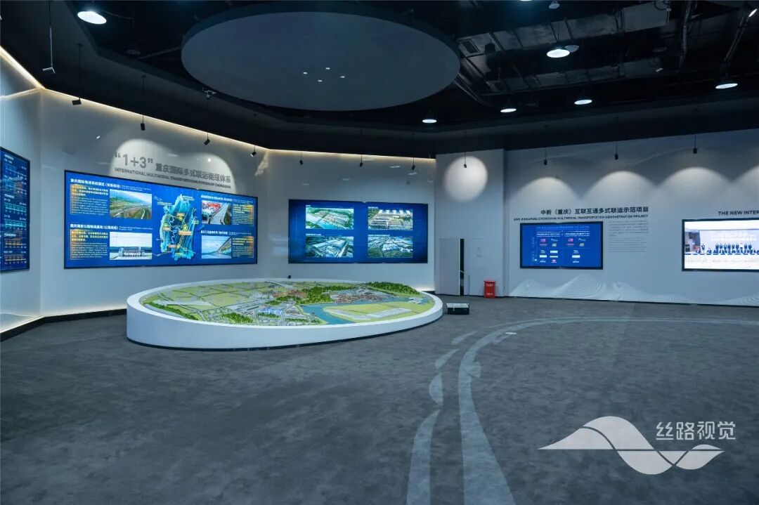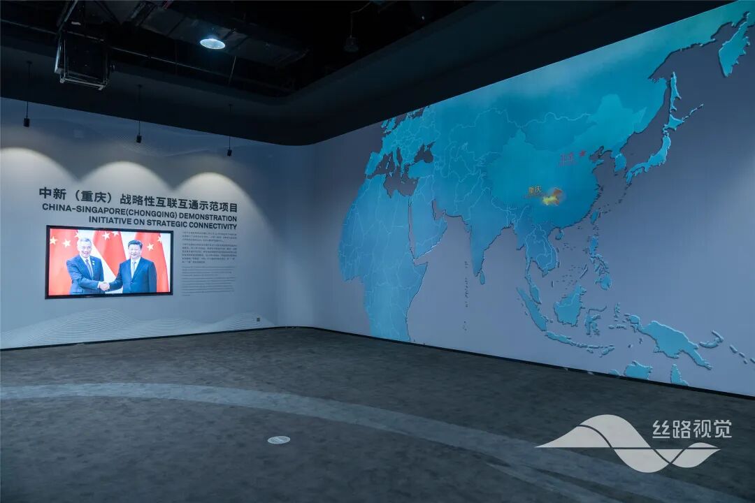 开阔的空间与简明的地面流线,营造出舒适的观展氛围。中新(重庆)战略性互联互通示范项目、陆海新通道、中新(重庆)互联互通多式联运示范项目,全部以艺术图文结合多媒体影像的形式展示出来。
