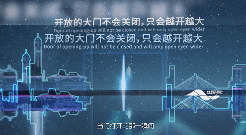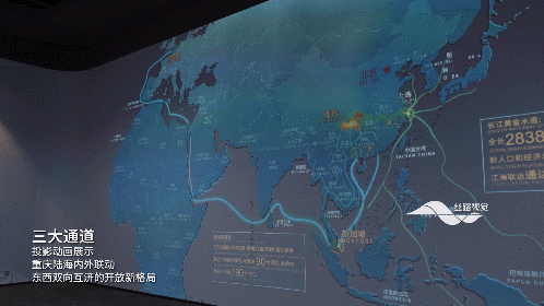 投影配合立体字,动静相宜地重点展示重庆主动融入国家战略、积极拓展开放通道、着力打造开放平台,形成“陆海内外联动、东西双向互济”的开放新格局。