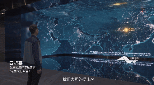四折幕沉浸式演绎专题影片《这里大有希望》,叙述了果园港在陆海新通道、中新(重庆)互联互通示范项目建设中的作用与成效。围合式的屏幕精彩演绎了绝佳的视觉效果。