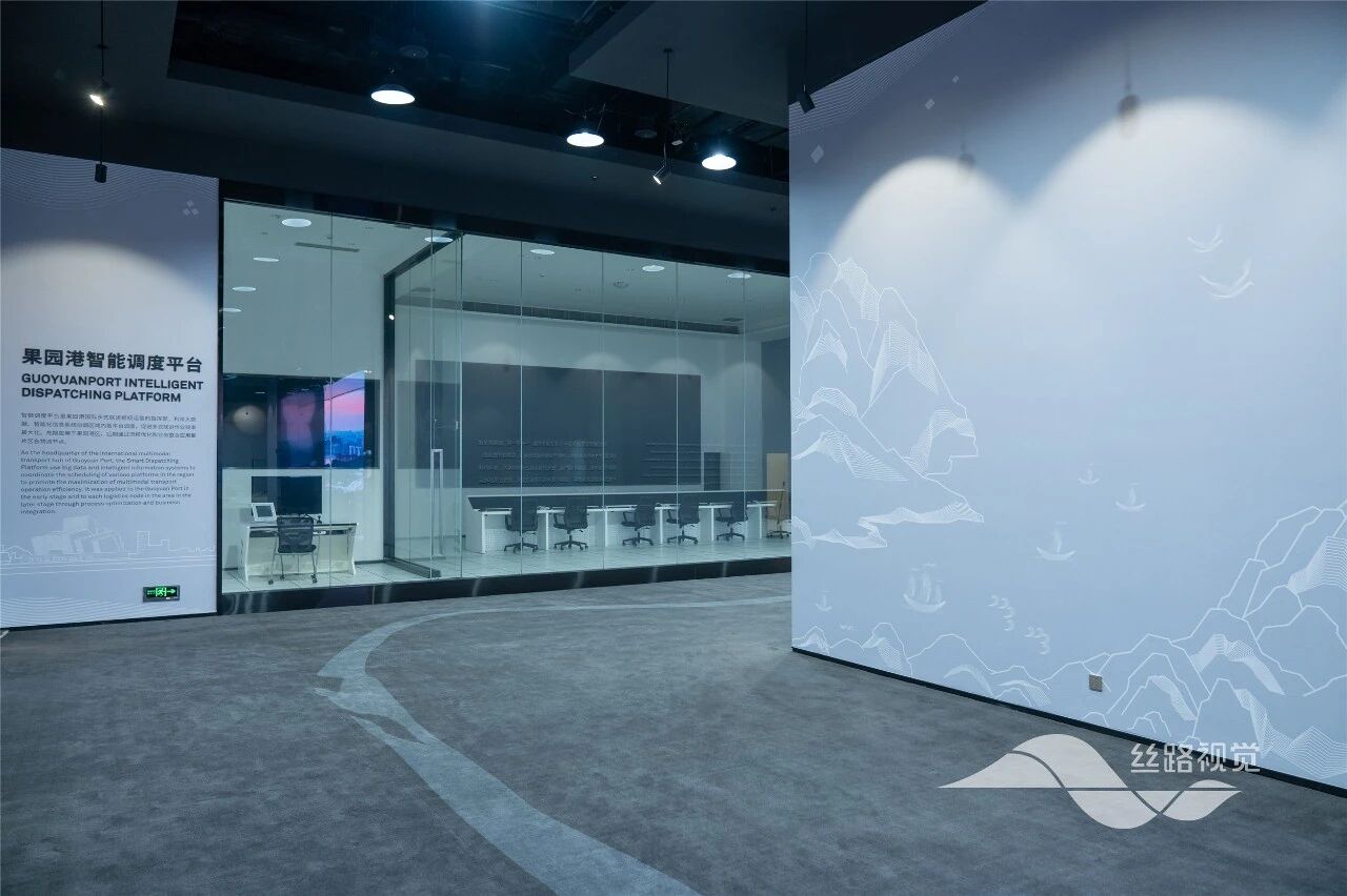 果园港国际多式联运枢纽展厅「中新(重庆)多式联运示范基地」,位于果园港集装箱功能区231平台,设计整体以“开放之门”立意,造型简约、大气。布展面积1500cm²,包含六个展示区、智能调度平台和室外观景平台。