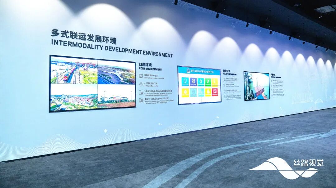 设计团队结合实体与艺术图文的形式,分别从口岸环境、产业环境、政策环境三个维度,对多式联运发展环境进行分别展示。