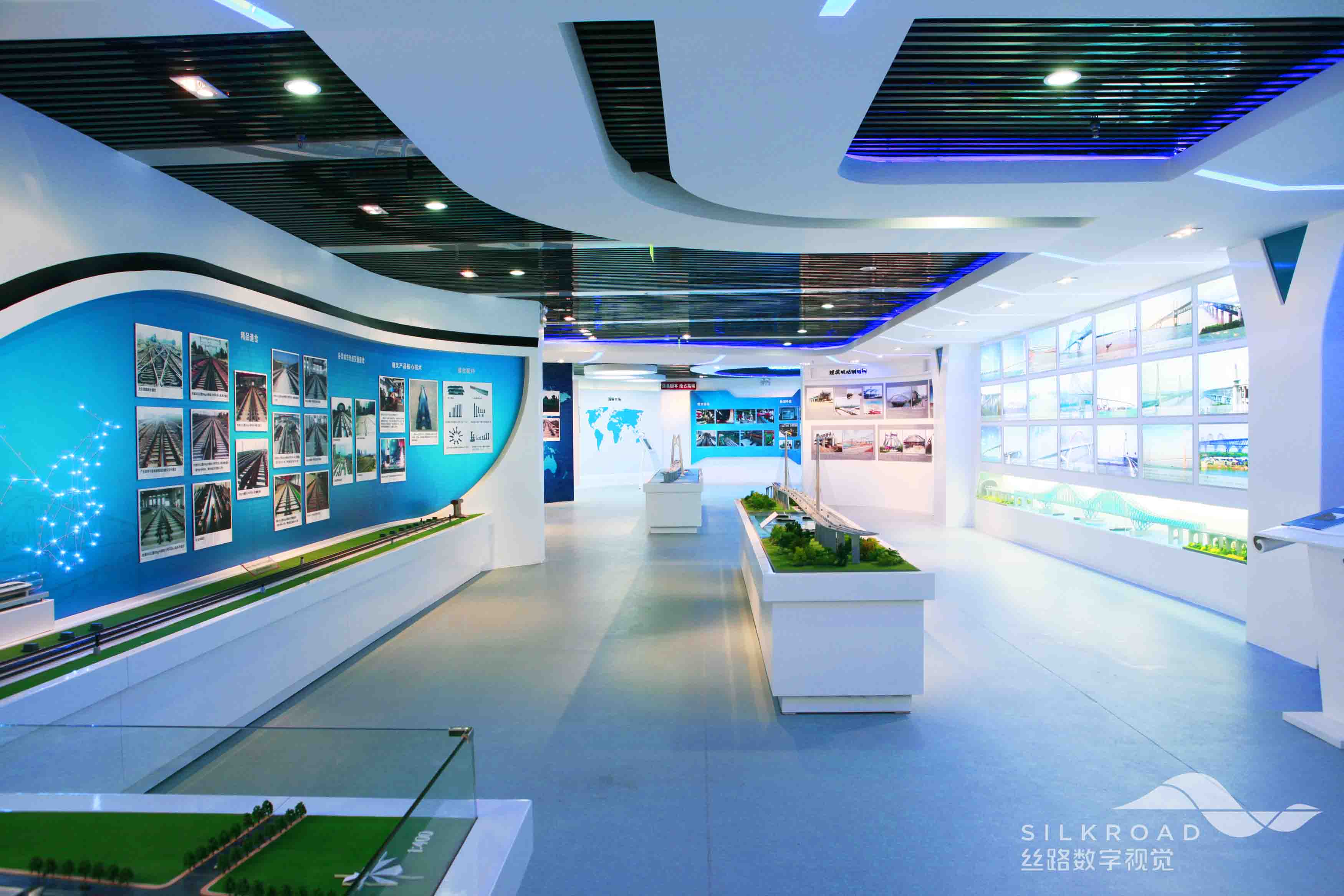 中铁山桥集团有限公司是我国近代以来桥梁企业的摇篮和鼻祖,历史悠久,拥有辉煌的历史,根据客户要求,展厅设计着重介绍钢桥建设的历史和现代,展厅将大量实物、沙盘展示和多媒体结合,既保持企业传统文化展示,又宣扬企业科技创新的理念。展厅未来篇中,三个方向的屏幕组成的一个虚拟未来之旅,展示企业未来全景展望。