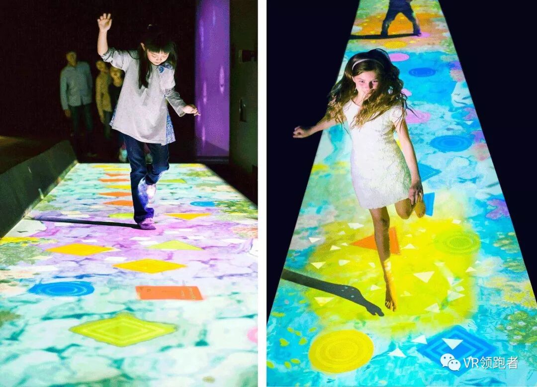 互动地幕系统采用悬挂在顶部的投影设备把影像效果投射到地面,当参访者走至投影区域时,通过系统识别,参访者可以直接使用双脚或动作与投影幕上的虚拟场景进行交互,各种互动效果就会随着你的脚步产生相应的变幻。