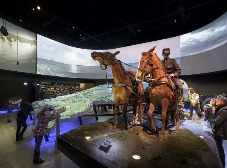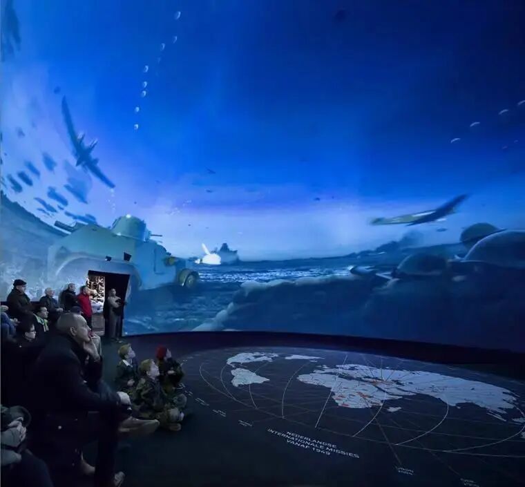 战争主题馆的270度的天幕,定时放映影片,以一种沉浸式影像的形式,全方位展示军事和社会的关系,包括荷兰历史上的著名战争、不同时期的战时新闻等等。
