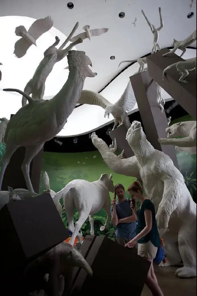 “世界碰撞大厅”中,大量现存和灭绝的动物雕塑,讲述了巴拿马地峡暴露时南北美洲物种交换的故事,这一过程至今仍在继续。