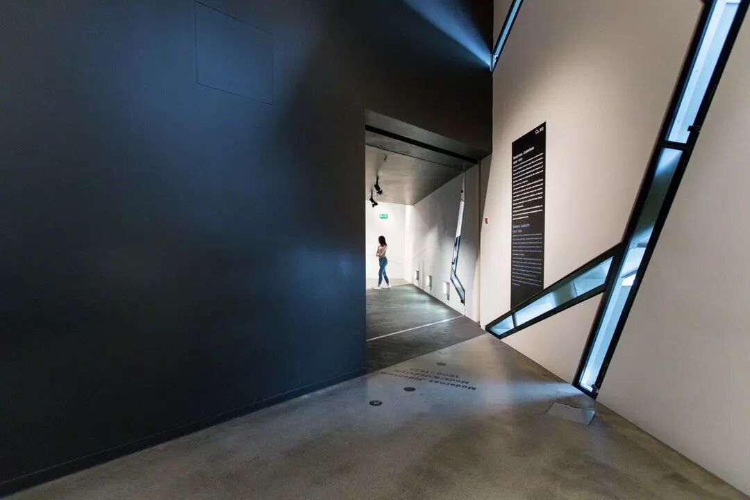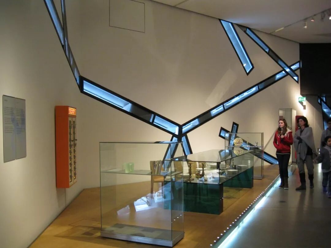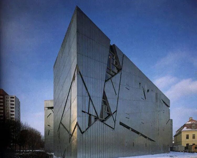 这座博物馆用来展出从4 世纪以来的德国犹太人的社会、政治以及文化历史,是欧洲最大的犹太博物馆。建筑地下1层,地上4层,整个建筑充满了激烈的冲突感,尖锐、棱角分明的镀锌金属表皮包裹着不规则的形体,以及形体上带有棱角尖的透光缝,裂缝似的玻璃窗,形成了强烈的视觉冲击。