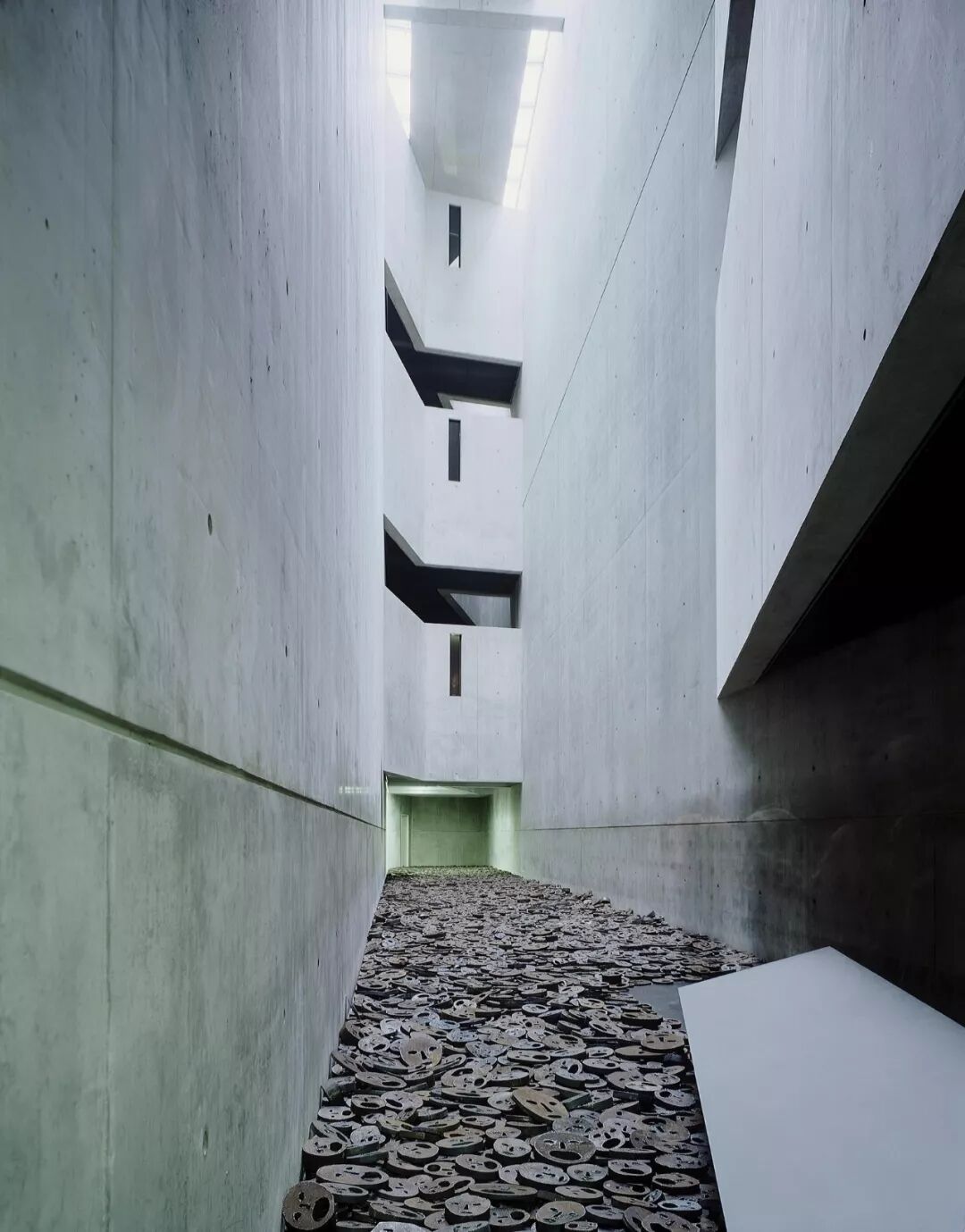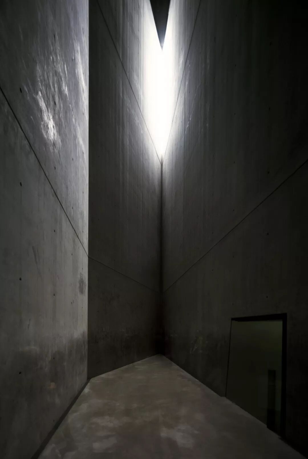 “死亡”轴线的尽端是“大屠杀之塔“,一间空的房子。从低矮的通道费力地推开沉重的铁门,空间很高(约20m),也很黑,仅在顶部有一丝亮光。空间中弥漫着死亡的气息,阴冷、潮湿,令人在黑暗中沉默、冥想。