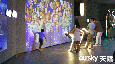 小朋友根据方格屏幕提示,随着音乐节拍按下,墙体投影画面会出现动态特效。随着玩家有节奏的拍打,最终呈现出具有极佳观感的画面。在现场火爆的情况下没有抢到互动魔方的小朋友可以触摸墙体体验不一样的趣味互动哦~