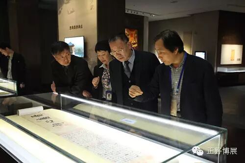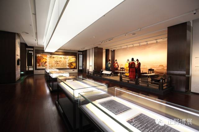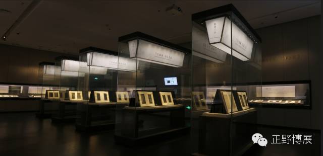 从家传到寺藏再到宫获《兰亭集序》在唐代有个传奇性的转折,观众远远即可看到一华丽精致的场景,唐太宗及大臣在殿堂之上细细品味《兰亭集序》的场景,前置五个超长的平柜,其中五大摹本可供观众细细品味。