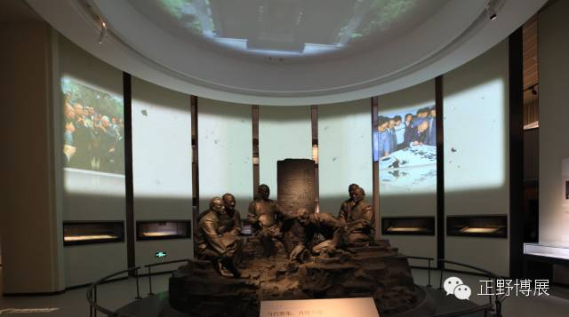 1987“中日兰亭书会”时隔千年而后的又一次重要雅集,充分利用空高,中心一组铸铁质感、栩栩如生的人物雕塑,结和顶部、背后环形投影,新成动静结合、三维立体展示,气势宏大。